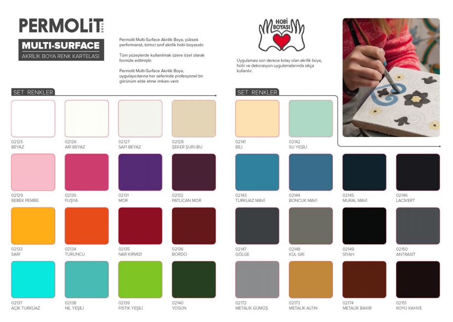 Permolit Multi-surface; tüm yüzeylere mükemmel yapışma özelliğine sahip, su bazlı, akrilik esaslı, sağlığa zararlı herhangi bir madde içermeyen, son derece dayanıklı yeni nesil bir boyadır. Ahşap-Cam-Kumaş-Seramik-Plastik-Metal-Tuval-Taş ve Tüm Yüzeylerde yüksek kapatıcılık ve dekoratif bir görünüm sağlar. İç ve dış tüm mekânlarda kullanıma uygundur. Uygulama sonrası bıraktığı parlak görünüm sayesinde ilave bir vernik uygulaması gerektirmez. Yapısı gereği uygulama esnasında yüzeyde mükemmel yayılırken gerekli düzeltmeler için kullanıcıya istenen süreyi tanır.