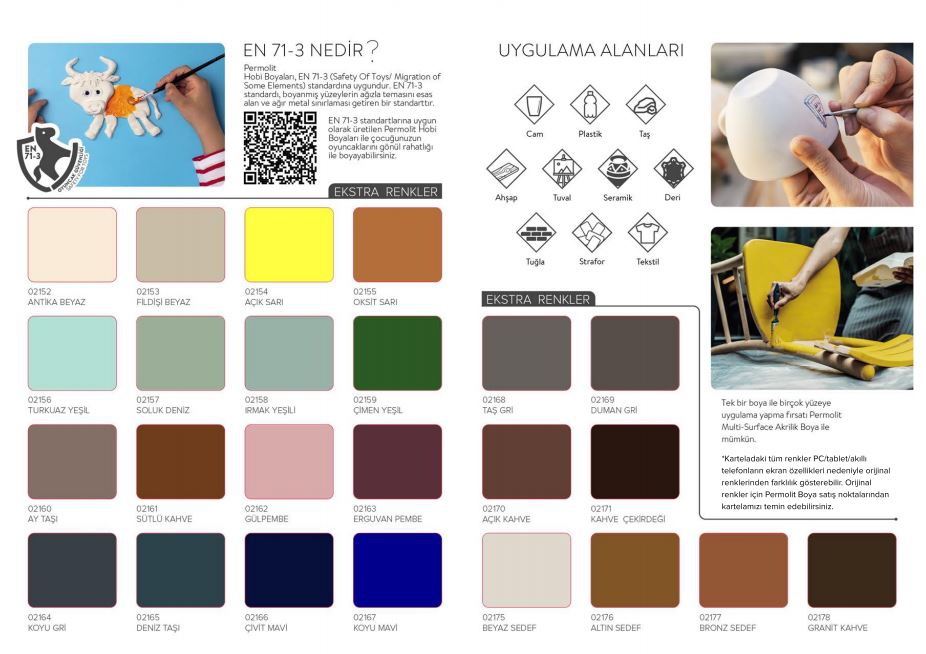 EN 71-3 (Çocuk ve Oyuncak Güvenliği) testini geçmiş ürünlerde, bu ağır metallerin hiç birisi bulunmaz. Dolayısıyla bu testi geçmiş ürünler çocuk oyuncaklarını, çocuk mobilyalarını boyayabilir ve tüm yüzeylerinizde güvenle kullanabilirsiniz.
